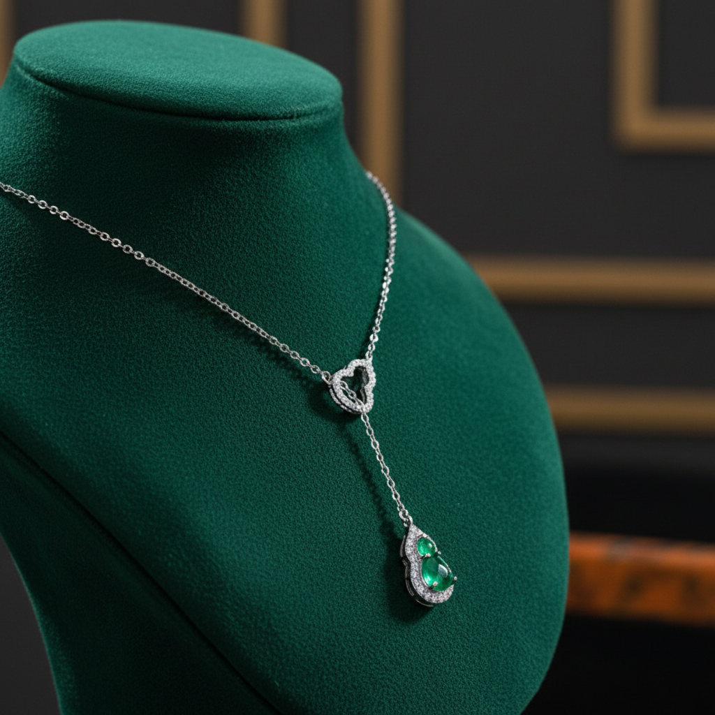This exquisite Y-necklace features genuine 925 sterling silver paired with natural green chalcedony gemstones. The lariat design with a delicate heart charm connector and teardrop pendant creates a sophisticated, feminine look that's perfect for any occasion.