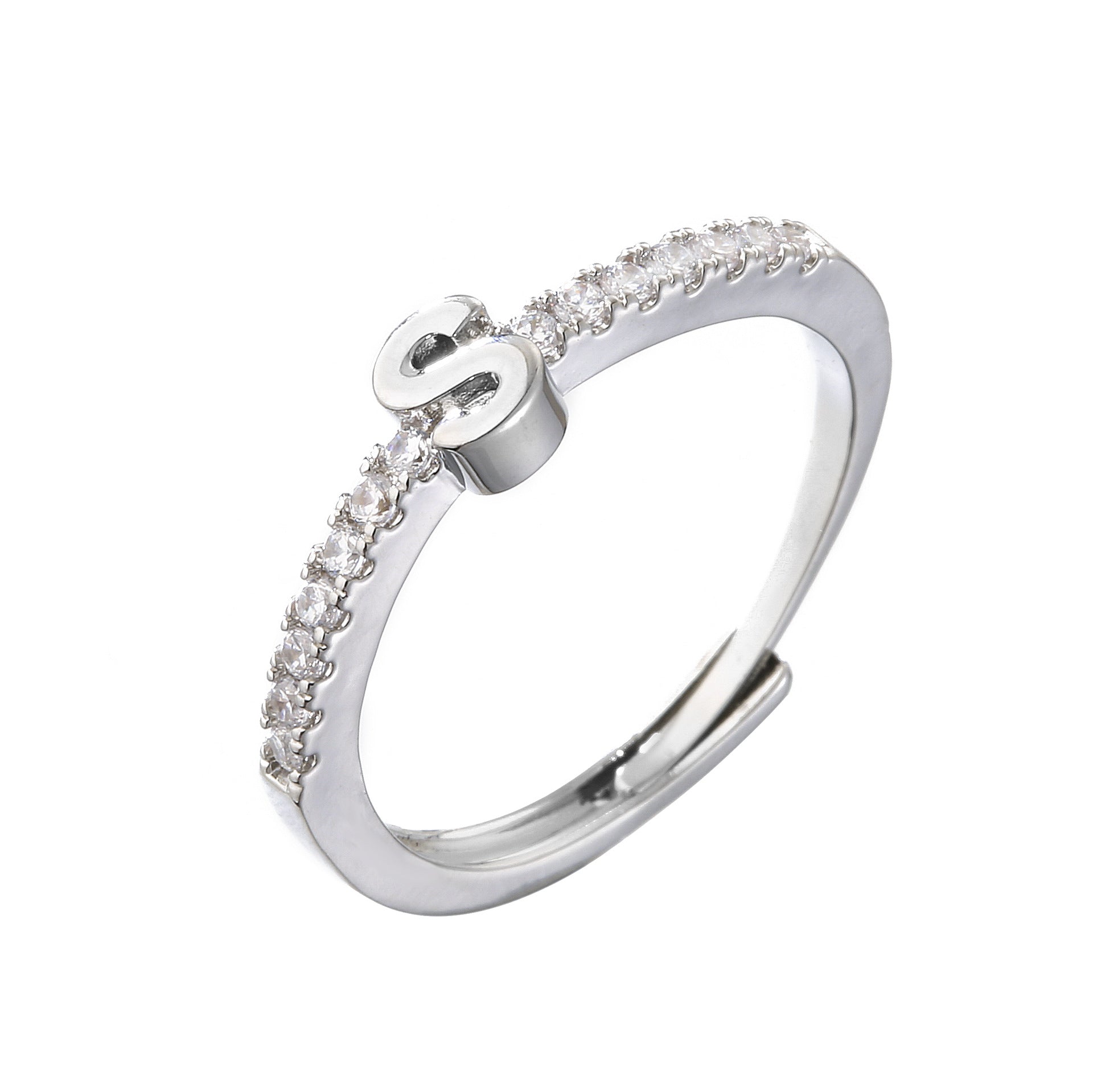 Elegant single row crystal letter ring featuring sparkling rhinestones. Available in both gold-plated and silver-plated finishes. The adjustable open band ensures a perfect fit for any finger size.