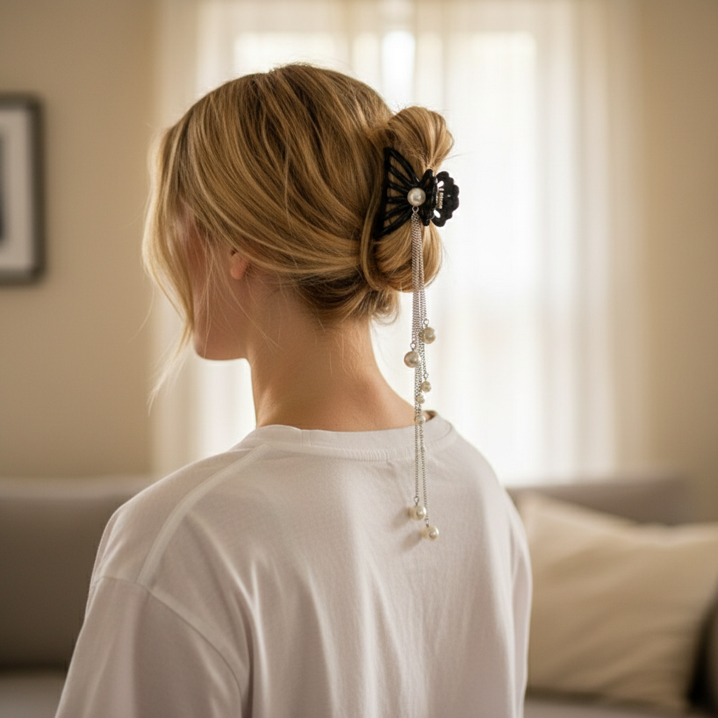 Elevate your everyday style with this exquisite black butterfly hair clip adorned with cascading pearl chains. The sculptural butterfly design adds a touch of whimsy, while the delicate silver-tone tassels with pearl accents create elegant movement with every turn.