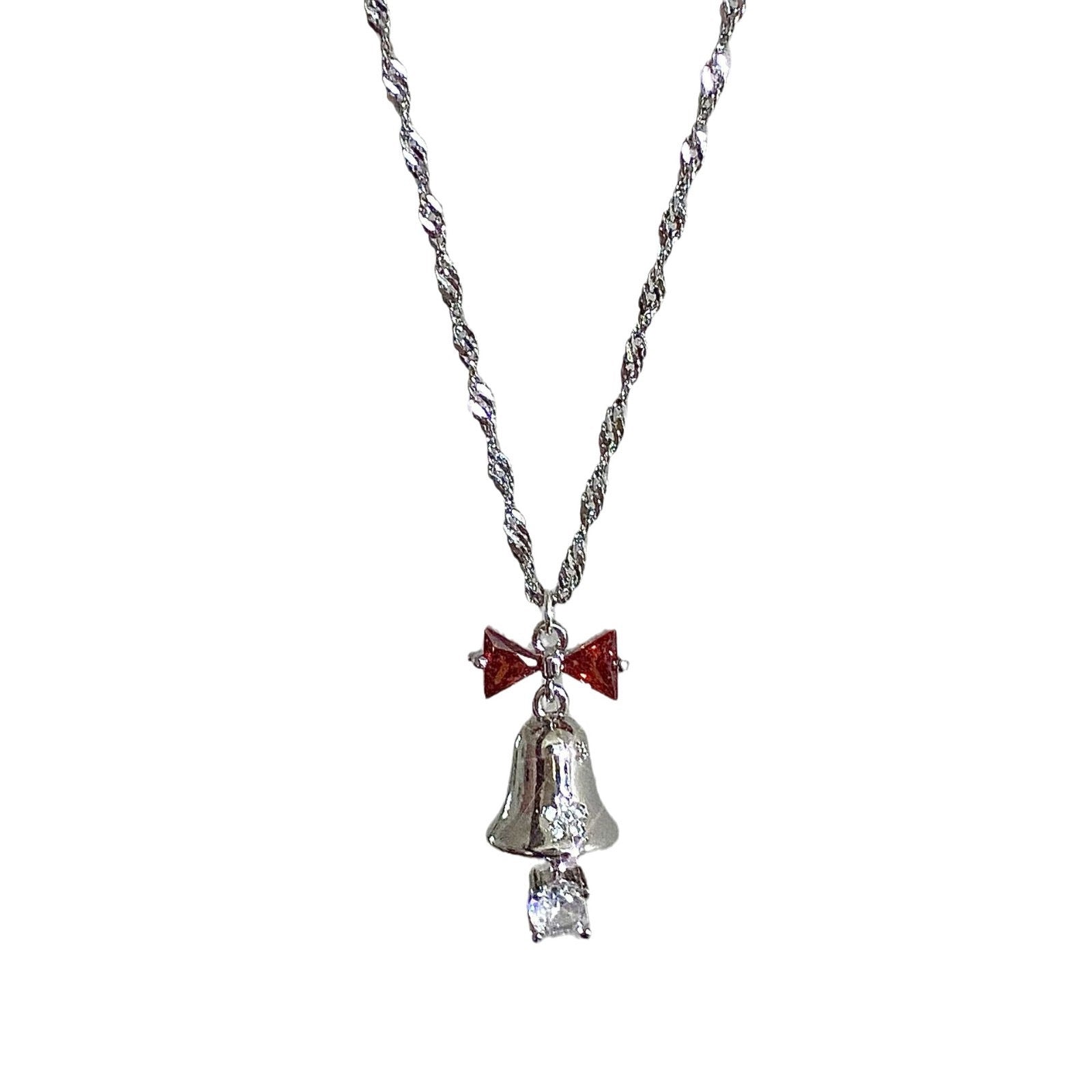 Christmas Bell Necklace Earrings Set - Red Bow CZ Jewelry Gold Silver Holiday Gift for Women