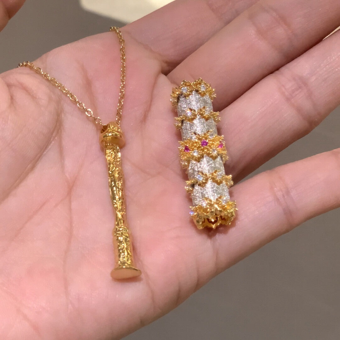 Luxury Gold Plated Kaleidoscope Cylinder Necklace - Handmade Brushed Finish with Gemstone Accents