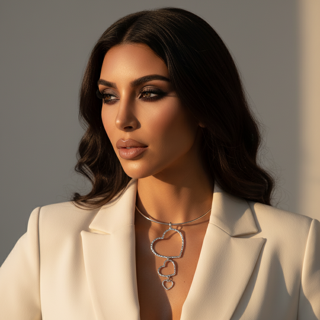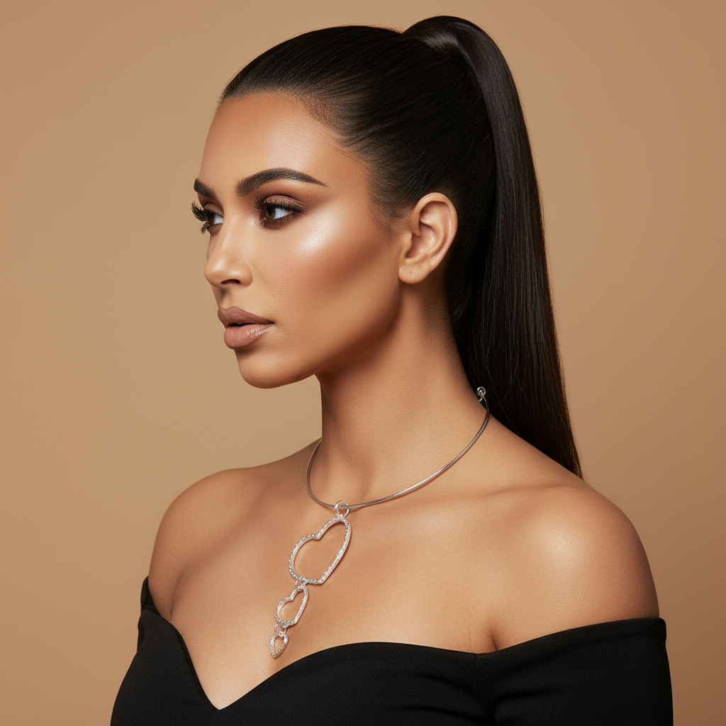 This bold silver hoop necklace features three graduated heart-shaped pendants that cascade elegantly down the chest. Each heart outline is crafted with delicate texture, creating dimensional depth as light plays across the surface. A glamorous piece that transitions effortlessly from day to night.