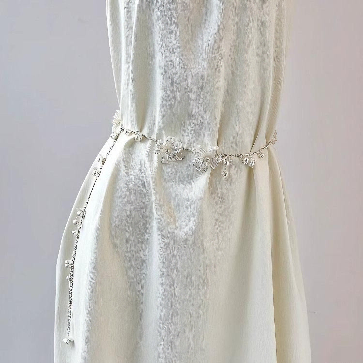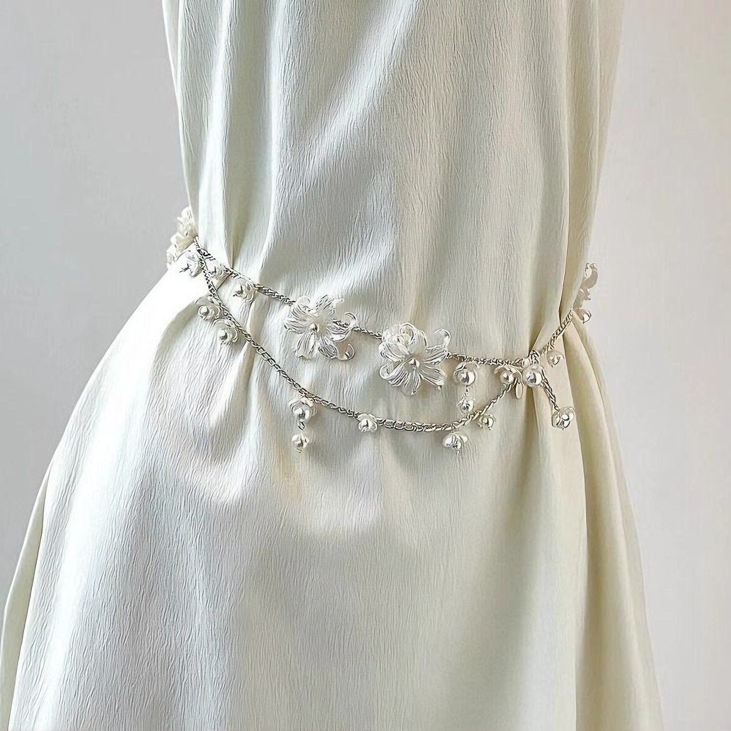 Elegant silver plated flower and pearl necklace that can be worn as both a necklace and waist chain, offering versatile styling options. Featuring premium silver plating with natural pearl accents for a luxurious look.